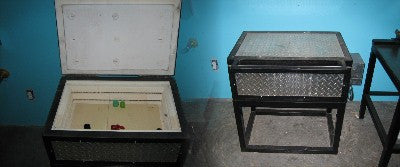This is a color box. It is 1 1/2" welded angle iron with aluminum diamond plate. Made of 2 1/2" 2300 degree brick with 2 1/2" fiber board lid. It is 17"x 28" outside, 13" x 24"x 6" deep inside and can be 120 or 240 volt, your choice. ALSO COMES With a fuji controller w/ K type tc.15 amps at 120 volt and 9 amps at 240 volts. ALSO Includes a welded stand .